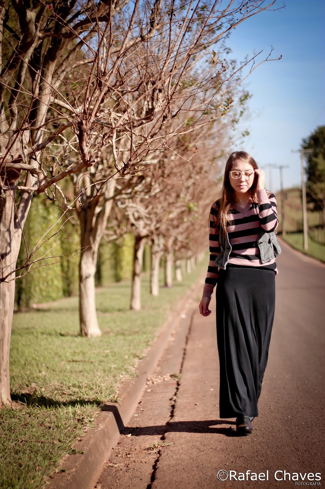 COM SAIA LONGA: tudo bem que quase não dá pra ver a bota, mas não poderia faltar um maxi comprimento! A blusa listrada deu uma alegrada na composição e o colete deu o toque final! A terceira peça sempre confere um charme à mais no look!